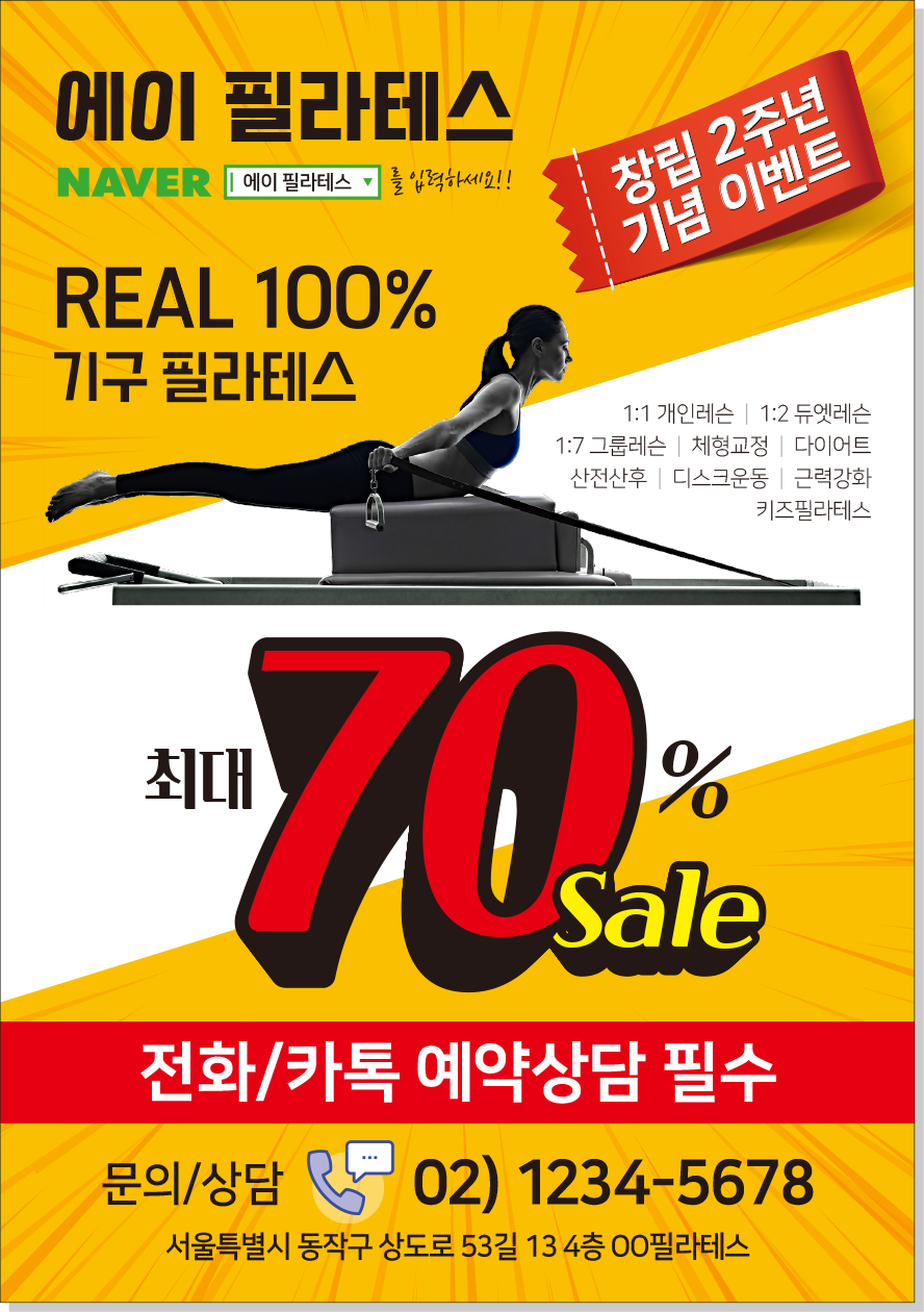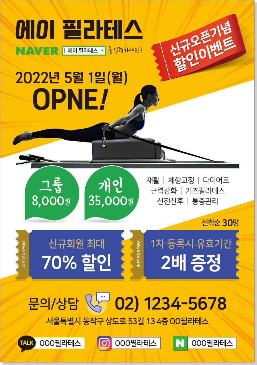 - 요가 필라테스 스튜디오 오픈이벤트를 알리는 광고전단입니다. 기념 할 이벤트는 무엇이든 가능합니다. 소비자를 유도하는 정보 외에 추가로 전달하고 싶은 정보가 있다면 이 디자인이 적합할 거 같습니다. 소량 인쇄를 원하실 땐 ‘카카오톡(id : eyefeeling) 또는 네이버톡톡’으로 상담 바랍니다.