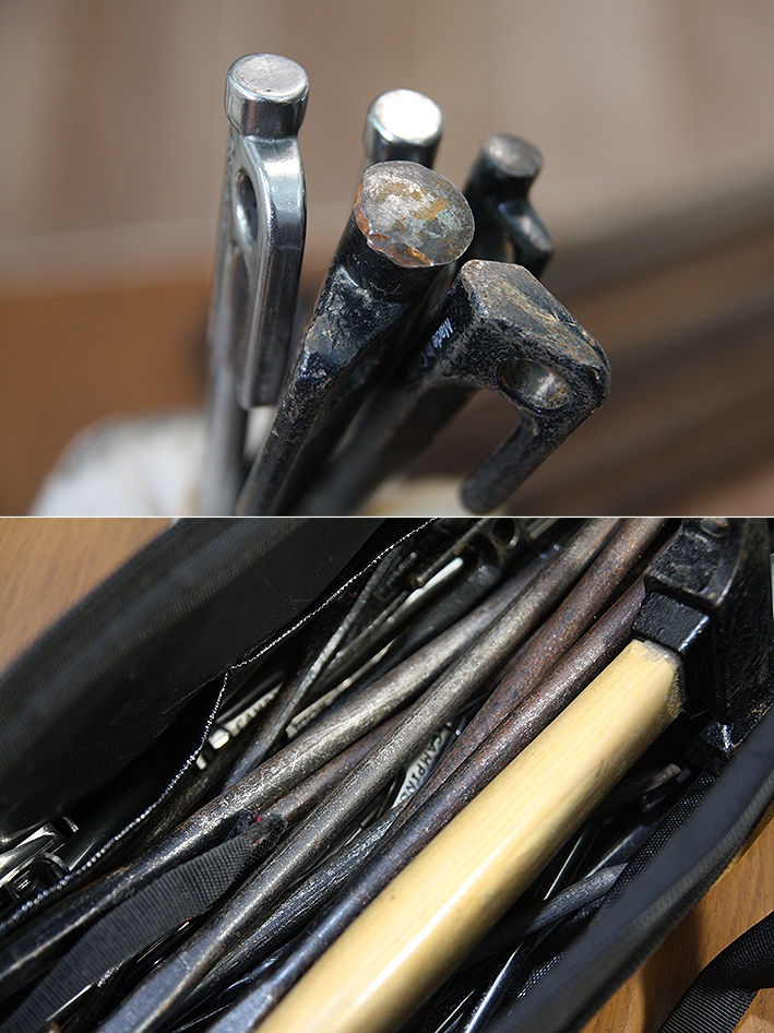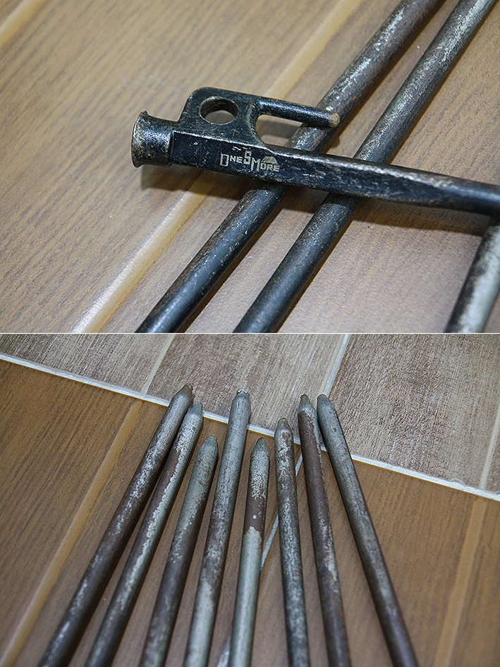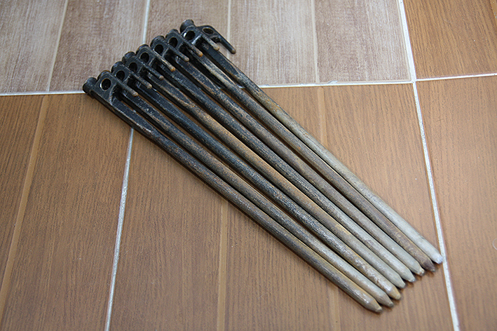 삼각스텐드를 땅에 고정하거나 작은 텐트와 전실 텐트 설치 때 주로 사용한다. 단조 팩(콜맨 제품) 6개와 스텐리스팩(캠핑문 제품) 8개가 있는데, 검은색의 팩은 엄밀히 따지면 단조 팩은 아닌 거 같다. 20cm의 팩은 굿이 망치로 두들겨 만들 정도의 강도가 필요한 것은 아닌지라 여기에서 ‘단조’는 편의상 또는 수제버거의 ‘수제’와 비슷한 역할이다.