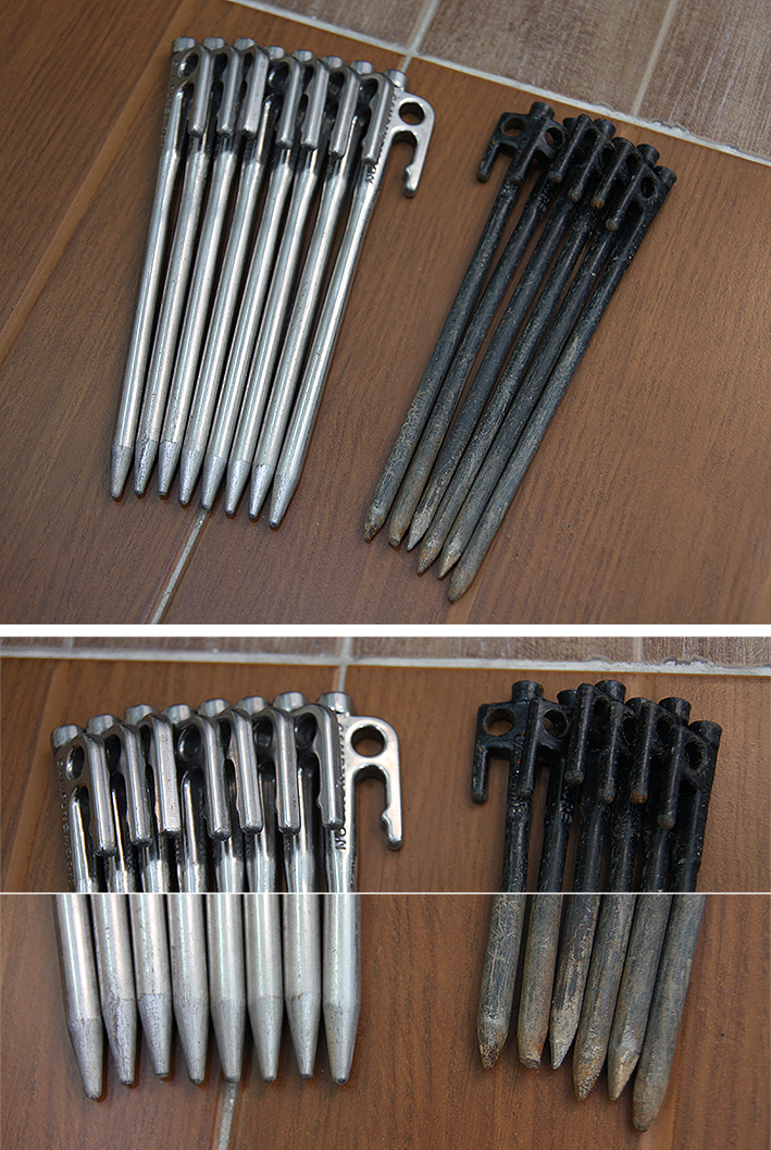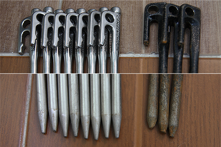 텐트를 구입하면 보통 기본으로 강철 팩이나 알루미늄 브이(V) 팩을 주는데, 자갈이 많이 깔린 오토캠핑장이나 노지 캠핑 시에 사용하기엔 약한 면이 있어 사용하지 않는다. 강철 팩은 보지도 않고(뭐 하러 이런 걸 주느냐며) 버리고, 알루미늄 팩은 언제 사용할지 모르지만, 모양새가 괜찮아 보관해두는 편이다.