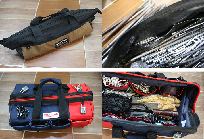 계절 또는 타프나 텐트의 구성, 먹을거리 등의 계획에 따라 챙기는 것들에 변화가 생기는데, 팩 가방과 자질구레한 것들을 담는 공구 가방은 항상 가져간다. 팩 가방은 브루크린웍스 제품이고, 공구가방은 스타렉슨의 TB-S042이다. 스타렉슨 공구 가방은 캠핑용은 아닌데 우연히 사용하게 된 후 나름 만족하며 사용 중이다. 예전엔 캠핑 팩까지 담았던 공구 가방인데 너무 무거워서 팩 전용 가방을 구입하게 됐다. 참고로 40cm 팩도 들어간다.