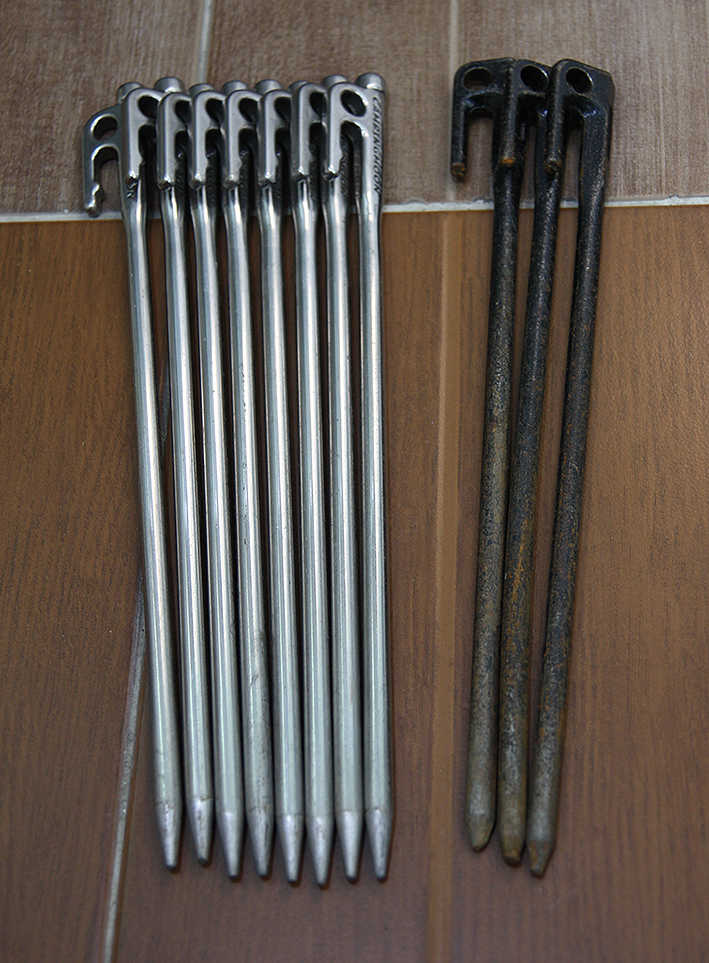 텐트를 구입하면 보통 기본으로 강철 팩이나 알루미늄 브이(V) 팩을 주는데, 자갈이 많이 깔린 오토캠핑장이나 노지 캠핑 시에 사용하기엔 약한 면이 있어 사용하지 않는다. 강철 팩은 보지도 않고(뭐 하러 이런 걸 주느냐며) 버리고, 알루미늄 팩은 언제 사용할지 모르지만, 모양새가 괜찮아 보관해두는 편이다.
