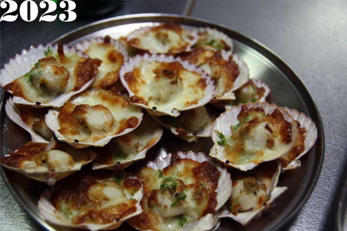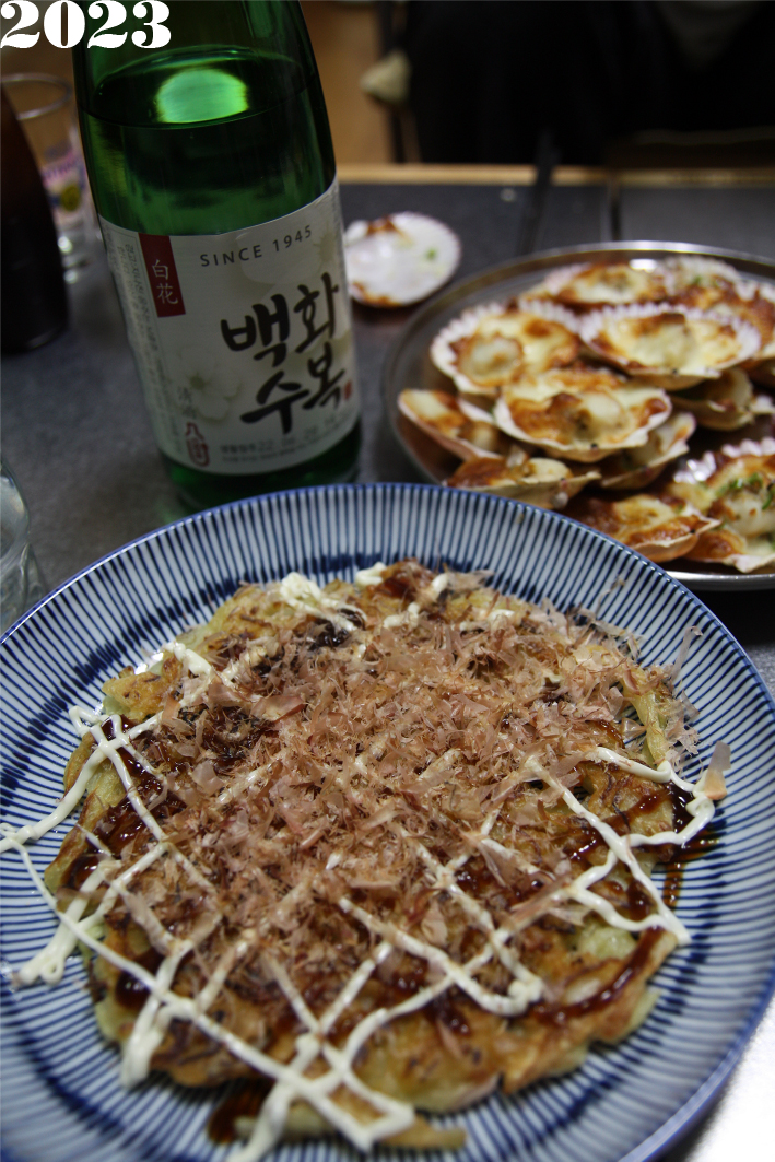 느긋이 일어나 아점으로 떡만둣국을 먹고 저녁으론 전날 음식 재료로 쓰였던 청주와 오코노미야키, 가리비구이로 2023년의 시작을 축하한다.