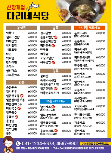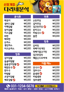 | 식당 분식 카페 배달음식 메뉴 자석 전단지 디자인 인쇄 제작 만들기-2 (0) | 2023.10.07 |