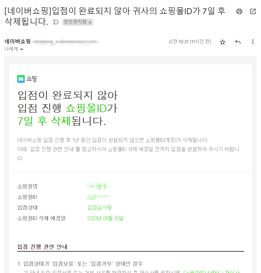 상담원에게 메일의 내용을 알려줬더니, 메일 제목 앞부분에 부서명이 표시되어 있다며 뭐냐고 묻는다. 메일 앞부분은 ‘[네이버쇼핑]’이라고 되어있다고 하니, ‘네이버쇼핑’에서 보낸 메일이라며 전화를 연결해 주겠단다. (전화를 돌려주기 전에 네이버쇼핑 전화번호도 알려달라 할걸 그랬다) 상담원의 도움으로 네이버쇼핑 관계자와 통화를 하게 됐고, 7주일 후 삭제되는 ID란 것은 내가 1년전 자사몰 입점하려 했던 자료가 남아있었는데, 더 이상 진행되지 않아 삭제된다는 것이란다. 지금 운영 중인 쇼핑몰과는 무관한 내용이란다.