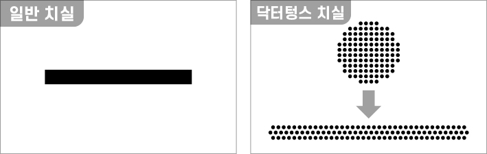 왼쪽이 일반 치실구조, 오른쪽이 닥터텅스 치실 구조이다. 닥터텅스 치실은 언뜻 보면 두께 때문에 치아 사이로 넣기 힘들어 보이지만 사용하기 위해 잡아 늘리며 치아 사이로 넣을때 실들의 배열이 넙적하게 바뀌면서 세정력을 높이는 면적이 확장된다.