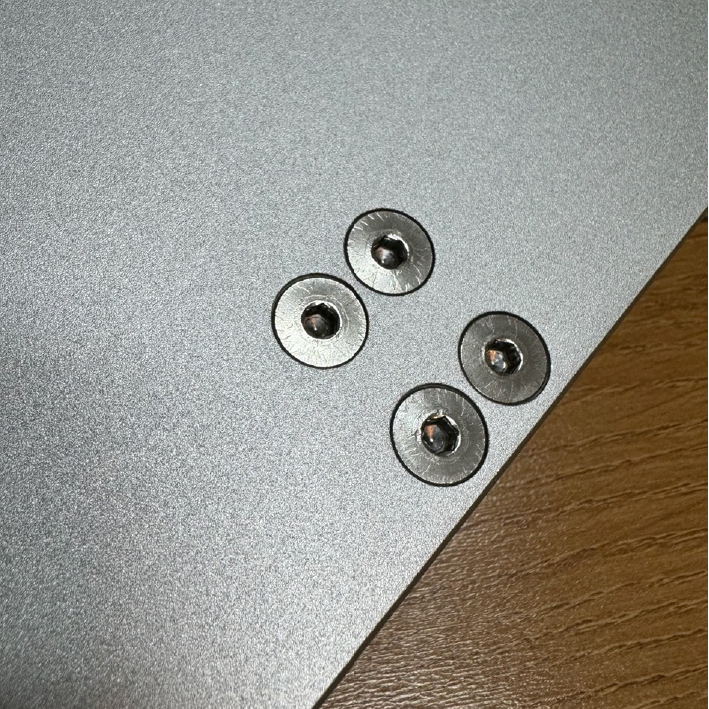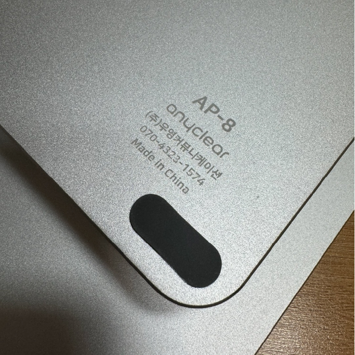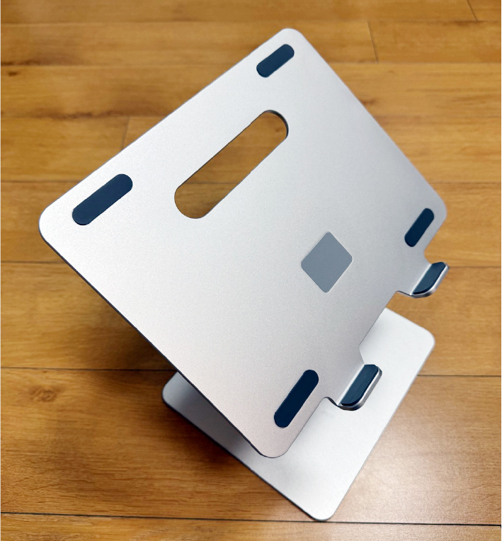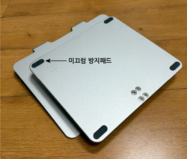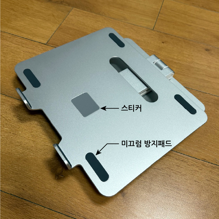 노트북이나 태블릿이 거치되는 부분엔 4개의 미끄럼 방지 패드가 부착되어 있다. 중간에 있는 사각 스티커는 안에 있는 나사를 가리기 위한 것이다.