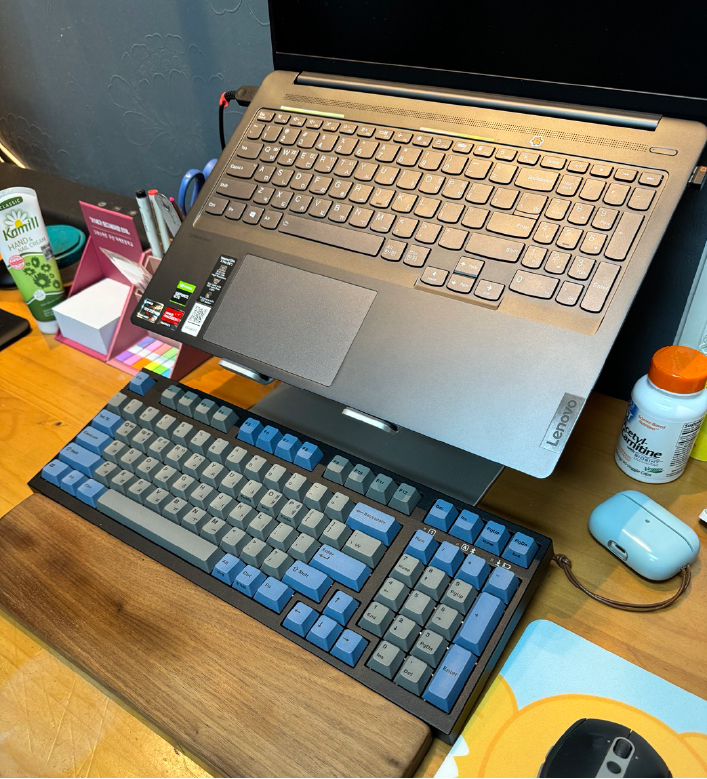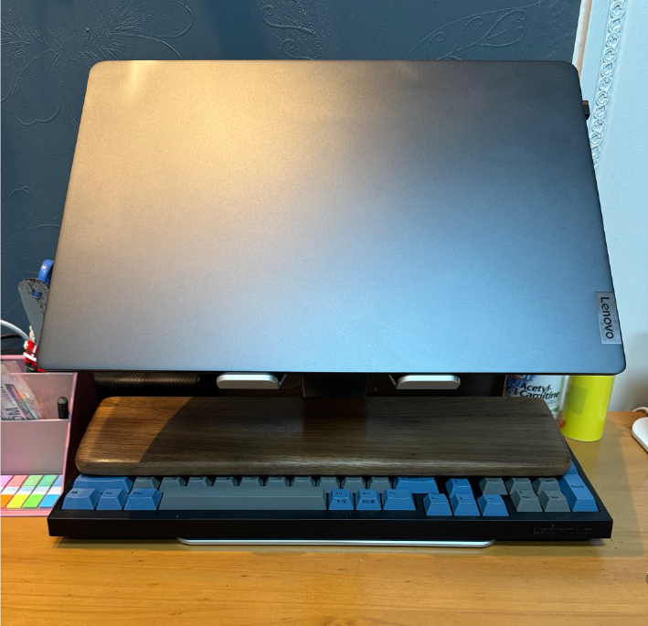 컴퓨터를 사용치 않을 땐 거치대 아래에 키보드를 둘 수도 있다.