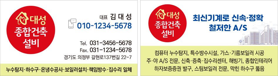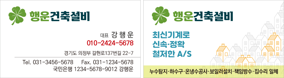 건축설비, 누수탐지공사, 인테리어를 위한 명함입니다.