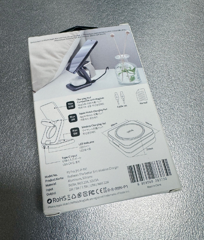 11월에 핸드폰을 아이폰 15Pro로 바꾸면서 맥세이프 기능도 사용하고 싶어 이전에 있던 거치대 형태의 무선 충전기는 처분하고 레드빈 P1 무선충전기를 구입하게 됐다.