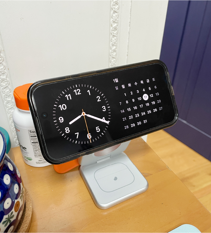 얼마 전 OS가 업데이트되면서 아이폰 12부터 대기상태에서 이렇게도 사용할 수 있게 됐다. 탁상시계 같으면서 괜찮다.