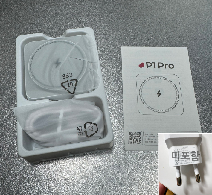 제품 상자를 열면 제품 설명서와 본 제품, 케이블(C toC)가 있다. 220V 콘센트는 미포함이다.